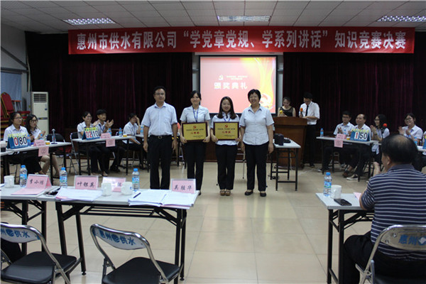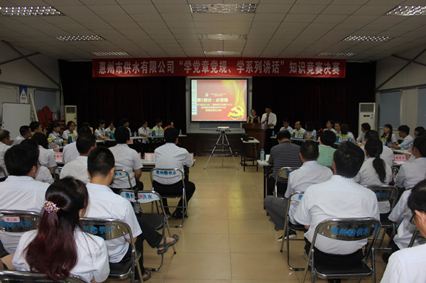 為進(jìn)一步營(yíng)造“兩學(xué)一做”學(xué)習(xí)教育的濃厚氛圍,7月11日下午,一場(chǎng)別開生面的“學(xué)黨章黨規(guī),學(xué)系列講話”知識(shí)競(jìng)賽決賽在市供水公司隆重舉行。市水務(wù)集團(tuán)黨委委員、監(jiān)事會(huì)主席羅運(yùn)通、市供水公司領(lǐng)導(dǎo)班子成員、黨員代表等90多人觀看了比賽。