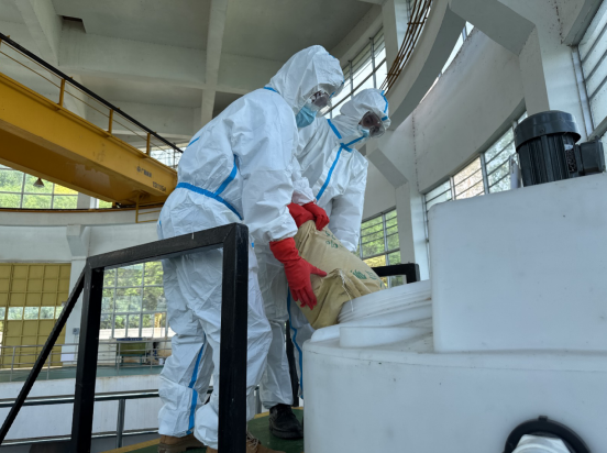 此次演練圍繞原水油跡污染及pH異常偏低兩個(gè)場(chǎng)景展開(kāi)。演練中,發(fā)現(xiàn)“取水口出現(xiàn)少量油跡污染”后,吸水泵房巡檢人員立即上報(bào)并警戒現(xiàn)場(chǎng),應(yīng)急小組迅速攜帶攔油網(wǎng)、吸油毯趕赴現(xiàn)場(chǎng),30分鐘內(nèi)完成油污攔截與吸附,快速控制污染。隨后模擬原水pH值為6.3時(shí),吸水泵房應(yīng)急加藥系統(tǒng)迅速啟動(dòng),現(xiàn)場(chǎng)處置組協(xié)同配置藥劑、調(diào)試設(shè)備,精準(zhǔn)投加調(diào)節(jié),不到1小時(shí)即讓水質(zhì)穩(wěn)定在安全范圍。演練過(guò)程中,吸水泵房作為一線處置陣地,及時(shí)啟動(dòng)應(yīng)急預(yù)案,確保取水水質(zhì)符合生產(chǎn)要求。同時(shí),將觀洞水庫(kù)作為備用水源隨時(shí)待命,形成“即戰(zhàn)即防”的堅(jiān)實(shí)防線。