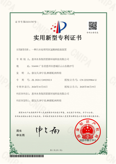 繼連續(xù)斬獲四項(xiàng)污水、污泥處理相關(guān)技術(shù)專利后,惠州水務(wù)集團(tuán)碧源公司在水務(wù)環(huán)保技術(shù)創(chuàng)新領(lǐng)域再傳捷報(bào)。8月19日,由碧源公司自主研發(fā)的“一種污水處理用次氯酸鈉投放裝置”榮獲國(guó)家知識(shí)產(chǎn)權(quán)局授予專利權(quán)并頒發(fā)實(shí)用新型專利證書(shū)。至此,公司已在水務(wù)環(huán)保領(lǐng)域累計(jì)斬獲五項(xiàng)國(guó)家授權(quán)專利,涵蓋污水、污泥處理等多個(gè)關(guān)鍵技術(shù)環(huán)節(jié)。
