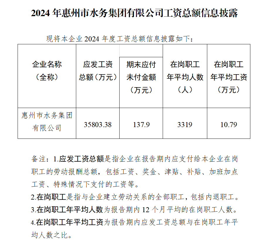 2024年惠州市水務(wù)集團(tuán)有限公司工資總額信息披露